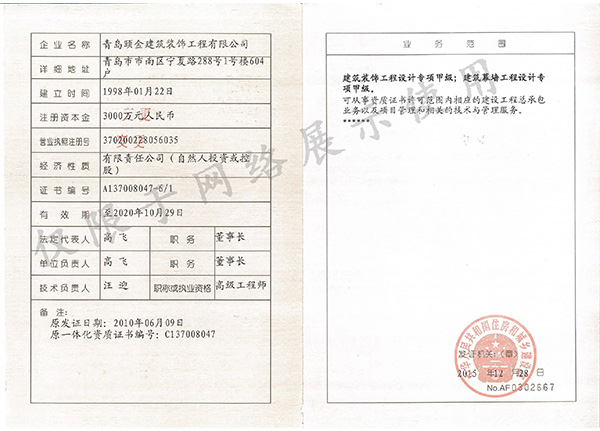 建筑機(jī)電安裝工程專(zhuān)業(yè)承包貳級(jí) 展覽陳列工程設(shè)計(jì)與施工一體化壹級(jí)